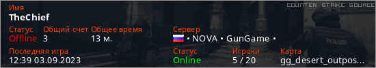 Играет на Counter Strike Source сервере. Страна: РоссияПервый раз замечен 12:38 23.05.2023