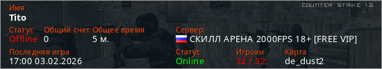 Играет на Counter Strike 1.6 сервере. Страна: РоссияПервый раз замечен 16:58 03.02.2026