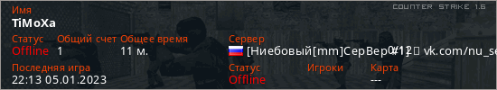 Последний раз был в сети 22:13 05.01.2023 Игрок с таким ником замечен на 6 серверах