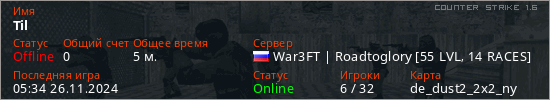 Играет на Counter Strike 1.6 сервере. Страна: РоссияПервый раз замечен 04:48 26.11.2024