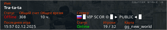 Играет на Counter Strike 1.6 сервере. Страна: РоссияПервый раз замечен 09:59 17.09.2025