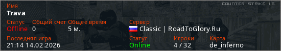 Играет на Counter Strike 1.6 сервере. Страна: РоссияПервый раз замечен 20:53 14.02.2026