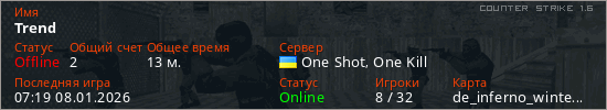 Играет на Counter Strike 1.6 сервере. Страна: УкраинаПервый раз замечен 08:50 06.01.2026