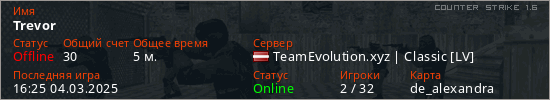 Играет на Counter Strike 1.6 сервере. Страна: ЛатвияПервый раз замечен 16:23 04.03.2025