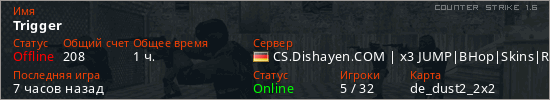 Последний раз был в сети 5 часов назад Игрок с таким ником замечен на 20 серверах