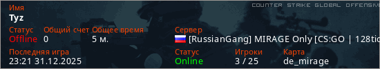 Играет на Counter Strike Global Offensive сервере. Страна: РоссияПервый раз замечен 23:14 31.12.2025