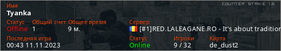 Играет на Counter Strike 1.6 сервере. Страна: РумынияПервый раз замечен 00:06 11.11.2023
