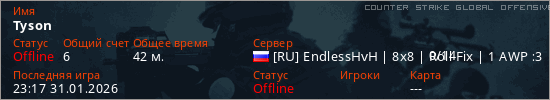 Играет на Counter Strike Global Offensive сервере. Страна: РоссияПервый раз замечен 19:14 30.01.2026