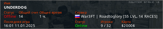 Играет на Counter Strike 1.6 сервере. Страна: РоссияПервый раз замечен 17:29 09.12.2024