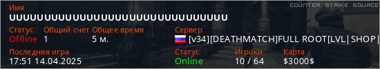 Играет на Counter Strike Source сервере. Страна: РоссияПервый раз замечен 17:49 14.04.2025