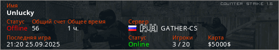 Играет на Counter Strike 1.6 сервере. Страна: РоссияПервый раз замечен 20:38 10.09.2025