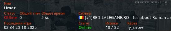 Играет на Counter Strike 1.6 сервере. Страна: РумынияПервый раз замечен 02:32 23.10.2025