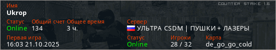 Играет на Counter Strike 1.6 сервере. Страна: РоссияПервый раз замечен 16:03 21.10.2025