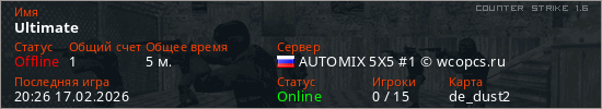Играет на Counter Strike 1.6 сервере. Страна: РоссияПервый раз замечен 20:24 17.02.2026
