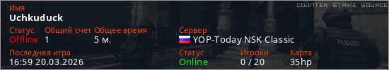 Играет на Counter Strike Source сервере. Страна: РоссияПервый раз замечен 16:51 20.03.2026