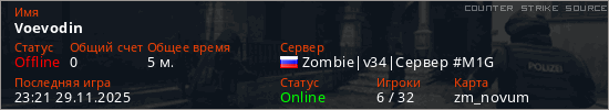 Играет на Counter Strike Source сервере. Страна: РоссияПервый раз замечен 23:19 29.11.2025