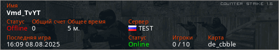 Играет на Counter Strike 1.6 сервере. Страна: РоссияПервый раз замечен 15:50 08.08.2025