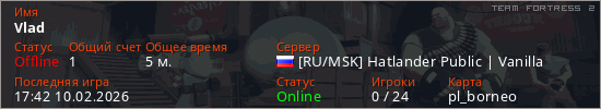 Играет на Team Fortress 2 сервере. Страна: РоссияПервый раз замечен 17:23 10.02.2026