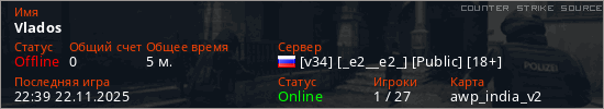 Играет на Counter Strike Source сервере. Страна: РоссияПервый раз замечен 22:23 22.11.2025