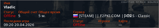 Играет на Counter Strike Source сервере. Страна: РоссияПервый раз замечен 09:15 20.04.2026