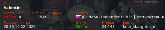 Играет на Team Fortress 2 сервере. Страна: РоссияПервый раз замечен 20:28 19.02.2026