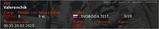 Играет на Call of Duty 4: Modern Warfare сервере. Страна: РоссияПервый раз замечен 16:27 18.02.2025