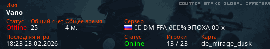 Играет на Counter Strike Global Offensive сервере. Страна: РоссияПервый раз замечен 18:13 23.02.2026