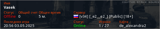 Играет на Counter Strike Source сервере. Страна: РоссияПервый раз замечен 20:54 03.05.2025