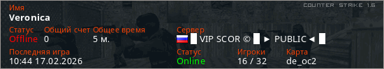 Играет на Counter Strike 1.6 сервере. Страна: РоссияПервый раз замечен 10:38 17.02.2026