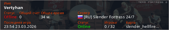 Играет на Team Fortress 2 сервере. Страна: РоссияПервый раз замечен 23:26 23.03.2026