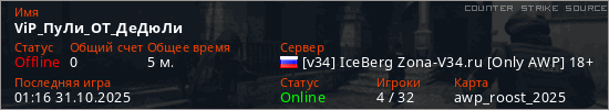 Играет на Counter Strike Source сервере. Страна: РоссияПервый раз замечен 01:12 31.10.2025