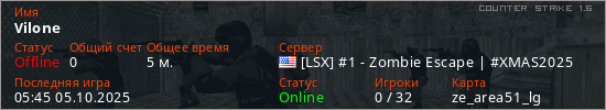 Играет на Counter Strike 1.6 сервере. Страна: СШАПервый раз замечен 05:43 05.10.2025