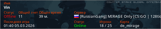 Играет на Counter Strike Global Offensive сервере. Страна: РоссияПервый раз замечен 20:52 12.02.2026