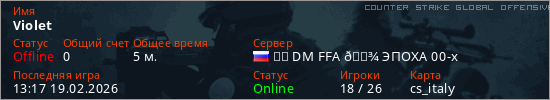 Играет на Counter Strike Global Offensive сервере. Страна: РоссияПервый раз замечен 12:32 19.02.2026