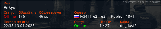 Играет на Counter Strike Source сервере. Страна: РоссияПервый раз замечен 21:43 26.12.2024