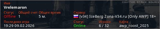 Играет на Counter Strike Source сервере. Страна: РоссияПервый раз замечен 19:27 09.02.2026