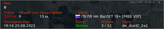 Играет на Counter Strike 1.6 сервере. Страна: РоссияПервый раз замечен 17:23 20.07.2025