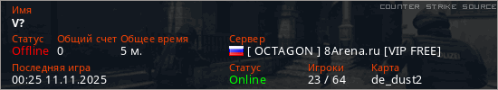 Играет на Counter Strike Source сервере. Страна: РоссияПервый раз замечен 00:08 11.11.2025