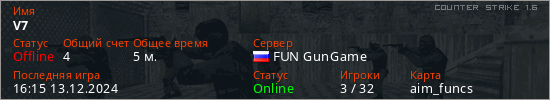 Играет на Counter Strike 1.6 сервере. Страна: РоссияПервый раз замечен 15:51 13.12.2024