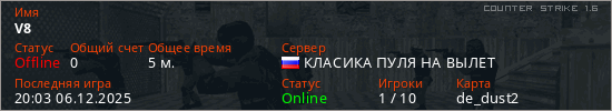 Играет на Counter Strike 1.6 сервере. Страна: РоссияПервый раз замечен 20:01 06.12.2025