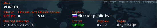 Играет на Counter Strike Global Offensive сервере. Страна: РоссияПервый раз замечен 21:11 04.04.2026