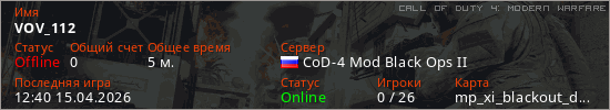 Играет на Call of Duty 4: Modern Warfare сервере. Страна: РоссияПервый раз замечен 12:35 15.04.2026
