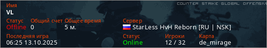 Играет на Counter Strike Global Offensive сервере. Страна: РоссияПервый раз замечен 06:06 13.10.2025