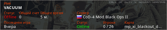 Играет на Call of Duty 4: Modern Warfare сервере. Страна: РоссияПервый раз замечен 22:09 24.04.2026