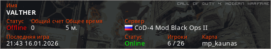 Играет на Call of Duty 4: Modern Warfare сервере. Страна: РоссияПервый раз замечен 21:23 16.01.2026