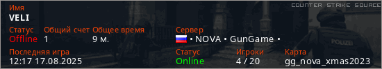 Играет на Counter Strike Source сервере. Страна: РоссияПервый раз замечен 17:13 15.08.2025