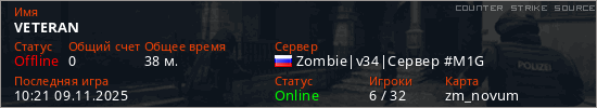 Играет на Counter Strike Source сервере. Страна: РоссияПервый раз замечен 11:34 31.08.2025