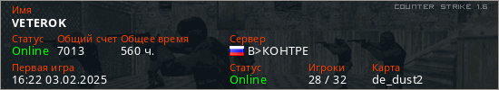 Играет на Counter Strike 1.6 сервере. Страна: РоссияПервый раз замечен 16:22 03.02.2025