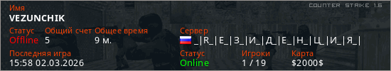 Играет на Counter Strike 1.6 сервере. Страна: РоссияПервый раз замечен 15:58 12.02.2026