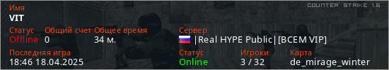 Играет на Counter Strike 1.6 сервере. Страна: РоссияПервый раз замечен 13:30 13.02.2025